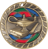 The Stained Glass Lamp of Knowledge medal depicts a lamp of knowledge on a stack of books.