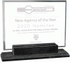 A classic Glass award. A clear rectangle that can go either horizontal or vertical. This award sits on a granite base.
