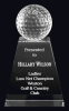 A crystal golf ball sits on top of an optic crystal pedestal. Total height 6 3/4".