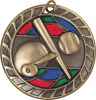 The Stained Glass Baseball medal depicts a helmet, baseball and bat.