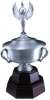 This beautiful, large trophy has a silver plated female victory figure on a silver plated three-handled cup, on a two-tiered hexagonal rosewood base.