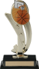 A gold banner of stars decorates the pillar which holds a 3D basketball and hoop. 8" trophy has a black base.
