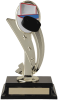 A gold banner of stars decorates the pillar which holds a 3D hockey puck and net. This 8" trophy has a black base.