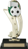 A gold banner of stars decorates the pillar which holds a 3D soccer ball and net. This 8" achievement award has a black base.