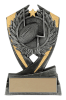 This pewter and gold resin trophy shows a laurel surrounding an American football and a goalpost.