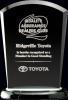 The Frontenac award is sleekly designed to showcase your personalized message by featuring a smoked glass panel that sits in a black glass base and adorned with a silver metal bar.