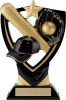 A baseball, glove, bat and helmet are surrounded by a shield, with a star at the apex of this black and gold resin trophy.