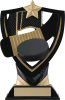 A hockey stick, puck and net are surrounded by a shield, with a star at the apex of this black and gold resin trophy.