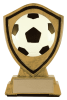 A full colour soccer ball is mounted on a gold shield with black accents.