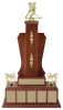This walnut annual trophy has a large vertical billboard for your message, and a horizontal area for a second title plate or 4 annual shields. The large base holds up to 21 annuals shields. Price includes your choice of three figures up to 6". View available figures here. Please specify figure choices in the comments section.
