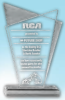 A clear acrylic piece overlaps a frosted acrylic piece behind it and sits on a clear acrylic base. The geometric angles give this award an artistic charm.