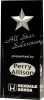 This thick tapered clear acrylic award is adorned with a carved out star, from the backside of the award to give a 3D appearance on the front of the award, which stands out against the black background.