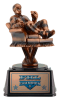 A bronze resin hockey player reclines in a chair, holding a water bottle and a remote. The trophy has a black plastic base. Great for fantasy hockey league winners. 7 3/4" height