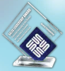 This geometric award combines a large clear acrylic diamond with a smaller blue acrylic diamond, on a clear acrylic base. 8 1/2" Height. Sample is shown with a white colour-fill option.