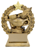 This gold coloured trophy has a quill, books, and lamp of knowledge surrounded by a garland.