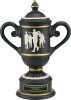 This double-handled dark green golf trophy cup has gold trim and a white silhouette of a golf team. A great trophy for tournament champions.