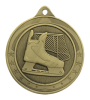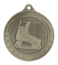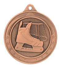 This modern 2" medal displays a hockey skate and net, accented by stars. Available in antique gold, antique silver, and antique bronze.