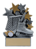 The 4 3/4" Star Blast resin series features an antique pewter finish and metallic gold accents. This Hockey Star Blast Resin depicts a skate, stick, puck and net.