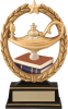 The laurel wreath of this resin trophy surrounds the colourful books and lamp of knowledge, highlighted by negative space.