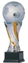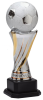 A ceramic silver soccer ball is held aloft by twisting silver and gold "wings".