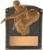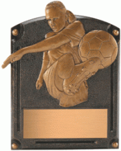This 3 1/2" x 4 1/4" resin plaque shows an antique gold soccer player with a textured pewter background. The two larger sizes come complete with an easel back and a built-in wall hanger. The small size comes with an easel back.