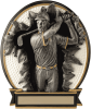 A male golfer bursts through an oversized ball on this resin oval. Comes with a wall hanger and an easel stand.