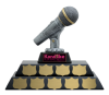This distinctive microphone annual trophy is sublime for any reoccurring public speaking events or competitions such as Toastmasters, comedy competitions, or talent showcases. The trophy itself is made up of a pewter mic topper with gold accents, attached to two black stackable tiers. Extra tiers can be added if needed and can be personalized with the winners' names on a variety of plate sizes and shapes.