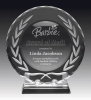 A laurel wreath adorns this optic crystal award, a symbol of triumph in academic, athletic, or other endeavors. The size of this stunnning award is 8 5/8" x 7 3/4" diameter. Comes with the stand shown and a satin-lined presentation box.