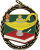 The colourful Negative Space Lamp of Knowledge medal depicts a lit oil lamp on a book, surrounded by a wreath.