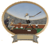 A great action shot of female players in this full colour baseball scene. Resin oval comes with wall hanger and easel stand.