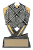 This 6" pewter and gold resin shows a laurel surrounding a backdrop of a billiards table and two crossed pool cues laid over top.