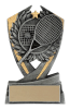 This 6" pewter and gold resin shows a laurel surrounding a backdrop of a tennis net with a tennis racquet and ball in front.
