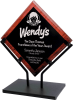 The Paragon award has a modern, sophisticated look. Red frames black acrylic, displayed in a black stand as a piece of art.