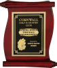 Three-dimensional scrolls adorn the ends of the curved rosewood piano finish plaque.