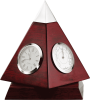This rosewood pyramid weather station has a thermometer, clock, barometer, and hygrometer with silver accents. The pyramid can spin on its rosewood base. Comes in a gift box and batteries for the clock are included.