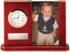 This piano finish rosewood clock and photo holder makes an appealing gift or award for those who like to keep hobbies or those they cherish within view. Comes in a gift box and batteries for the clock are included.