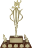 This trophy has a two-tier genuine walnut annual base. The top tier holds the trophy title plate and a slender gold spiral cup with a figure on top. There are two figures and five annual shields across the bottom tier. Price includes your choice of three figures up to 6". View available figures here. Please specify figure choices in the comments section.