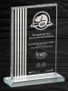 This glass award features a glass rectangle with five mirrored stripes decorating the left hand side.