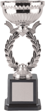 This cup almost floats on an open laurel wreath. The black rectangular base has a good amount of space for your artwork/ message.