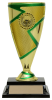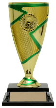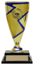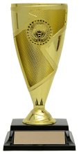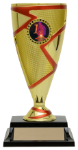 With a modern splach of colour and an optional 1" mylar insert to accent the center section of the cup, this trophy can be personalized while economically suiting all types of events. Gold trophy with accent colour choice of red, green, blue, gold, and black. Comes with a slim rectangle black base. View available insert options here. Please specify color accent choice and insert choice in the comment section below.