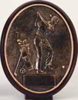 This 6 1/2-inch Golf Driver Oval Trophy offers a timeless, elegant way to recognize achievement on the course. Featuring a raised male golfer in mid‑swing alongside a golf bag and clubs, the design captures the precision and focus of the game. The sculpted relief sits within an oval frame finished in a rich antique bronze tone, giving the award a classic, traditional look suitable for any level of competition.
