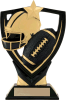 A football and helmet are surrounded by a shield, with a star at the apex of this black and gold resin trophy.