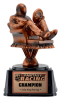This 7 3/4" trophy is perfect for any fantasy racing league or as a gift for the ultimate racing spectator. Features a bronze-finish racer reclining in his chair and holding a steering wheel.