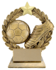 This gold coloured soccer trophy has a cleat and ball surrounded by a garland.