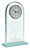 The Meadowbrook glass clock is an elegant 8" tall piece that features a gold clock with a roman numeral clock face embedded into a freestanding glass piece that can be personalized. A great way to express appreciation for their time.