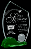 The Nicklaus glass award is great for golf tournaments or a memorable gift for the golf lover in your life. This award is 5 3/4" x 8 1/8" and features uniquely shaped clear glass on a green glass base and adorned with a frosted golf ball.