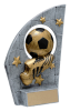 This pewter finished resin trophy features a soccer net backdrop adorned with a gold and black soccer ball and cleat.